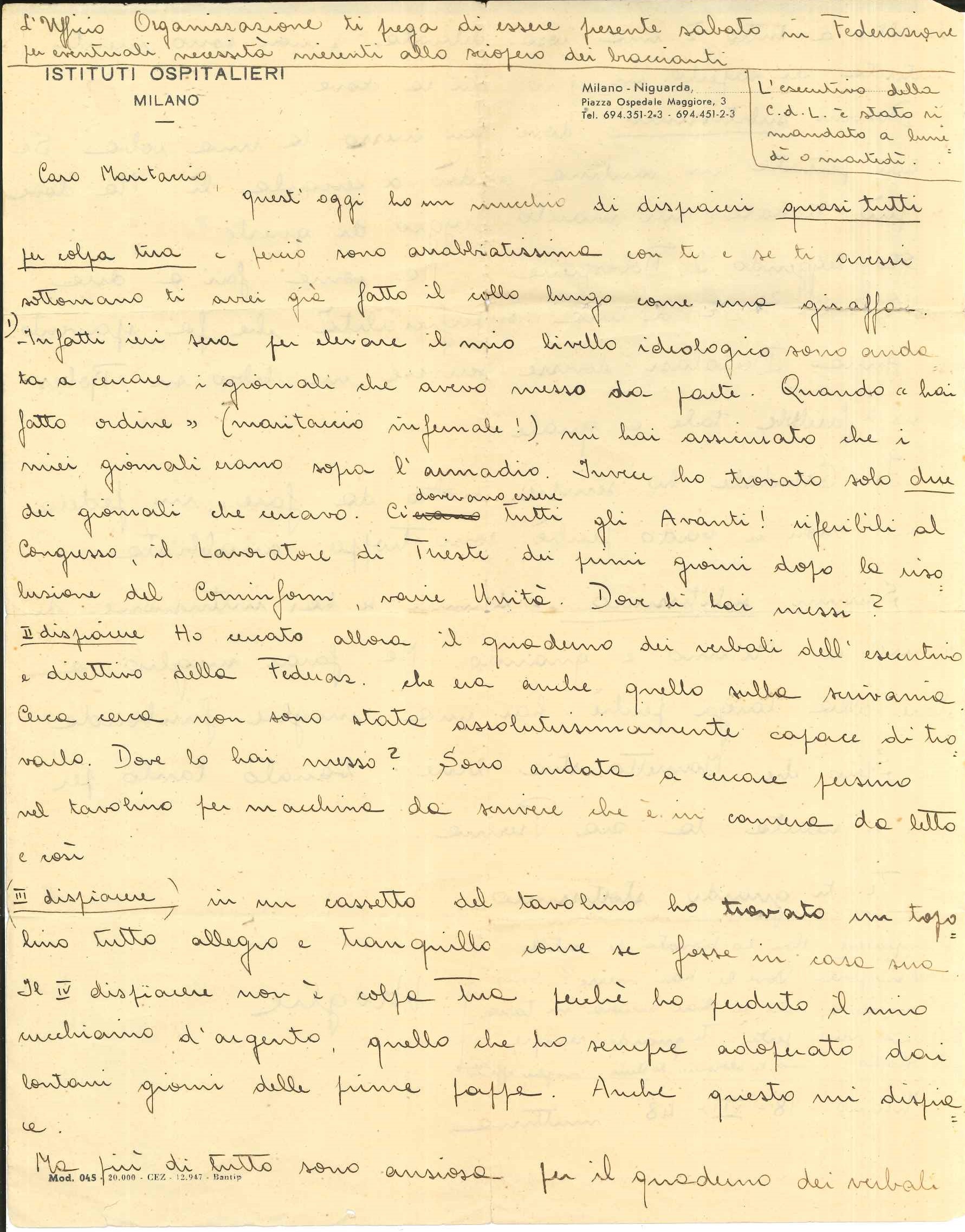 l’ho sempre detto io che sei un imbroglione e che cerchi sempre d’ingannarmi! Prima mi hai spiegato con tante ragioni commoventi che dovevi restare a Roma perché il Partito, i lavoratori, la classe operaia ecc. ecc. avevano bisogno di te ed ora salta fuori che non era vero niente e che potevi benissimo venire a Milano. Ma bene! Ed io ti ho sempre creduto da quella scema che sono […] e il peggio è che la prossima volta che tirerai fuori il Partito, i lavoratori, la classe operaia, ecc. continuerò a crederti e invece sarà per qualche Romana di Roma […] Siamo destinate a essere sempre imbrogliate noi povere donne!